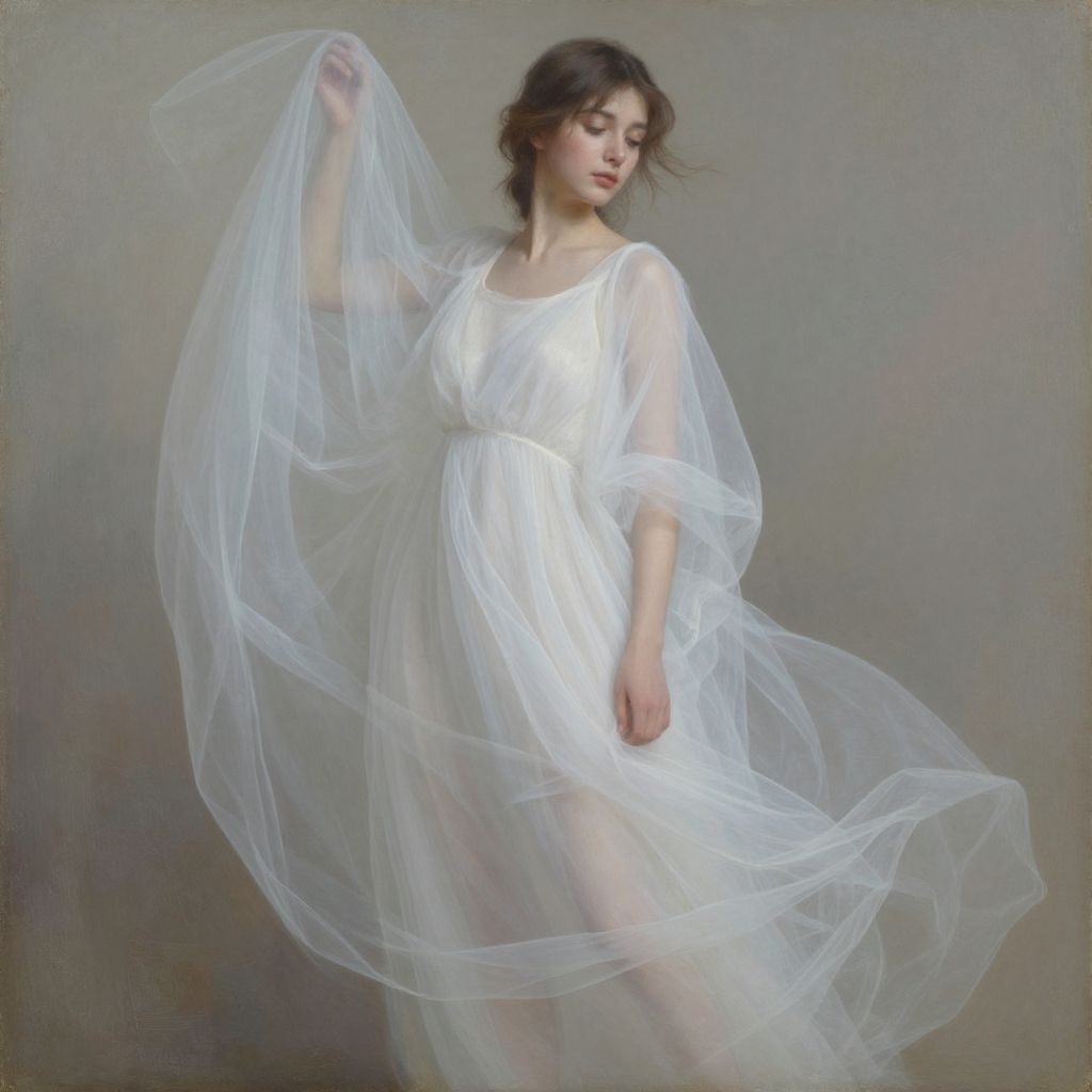 A dreamy, impressionistic interpretation of introspection showing a figure enveloped by swirling, translucent ribbons of light and color, merging with a background of abstract shapes and soft glowing orbs, symbolizing inner exploration, emotion, and mental clarity in a peaceful ambiance.