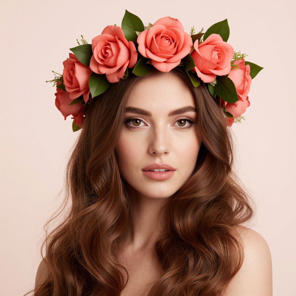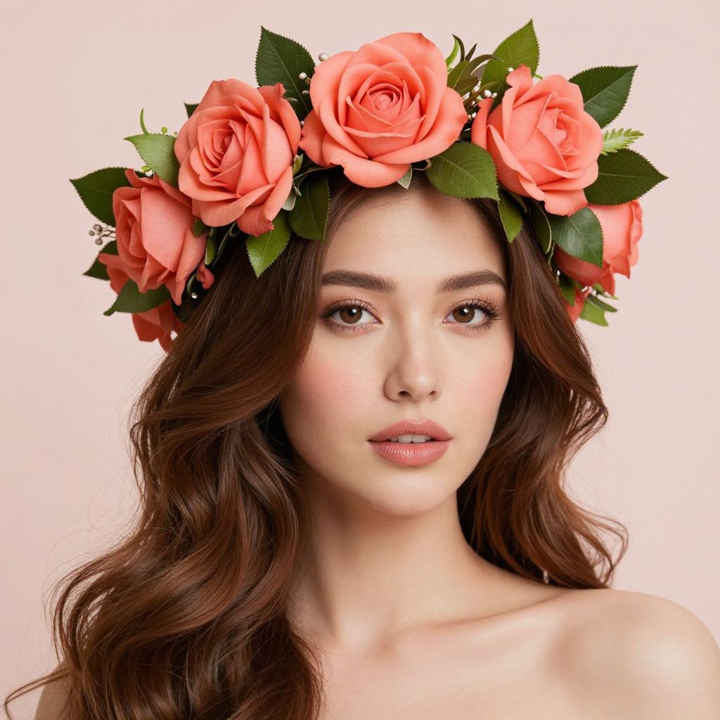 Woman adorned with a vibrant crown of coral roses and lush green leaves, her long brown hair cascading gracefully around her shoulders, set against a soft, pastel backdrop.