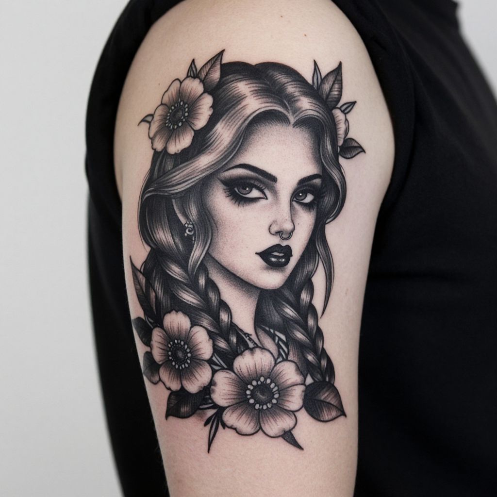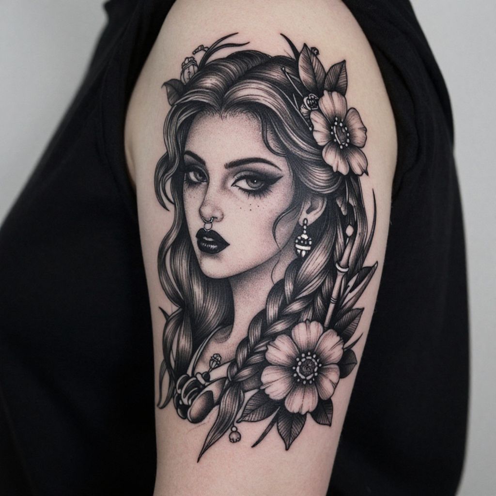 This is a detailed black and gray tattoo on a person's upper arm. The tattoo features a gothic-style woman with wavy hair in braids, adorned with flowers. She has dramatic, thick eyebrows, heavy eyeliner, and black lipstick. She also has a nose ring and freckles. The flowers and leaves in the design are intricately detailed, adding a touch of elegance to the gothic aesthetic. The background is mostly white, emphasizing the tattoo.