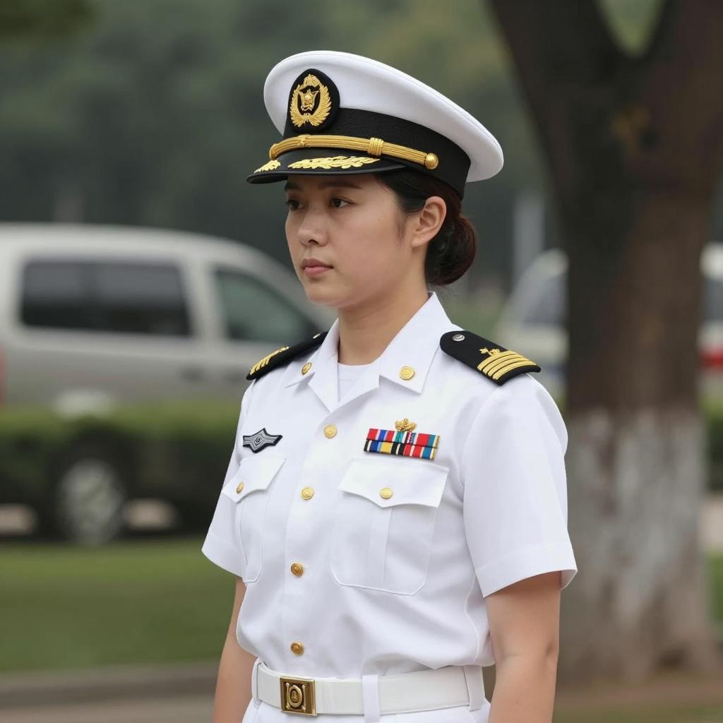 Photograph of a female naval officer standing outdoors. She wears a white uniform with short sleeves, black and gold peaked cap, and several ribbons on her left chest. Her dark hair is tucked under the cap, and she has a neutral expression. The background includes a tree to the right and a blurred vehicle. Green grass and trees are in the distance. The officer's right arm rests along her side, and she faces slightly to the left.