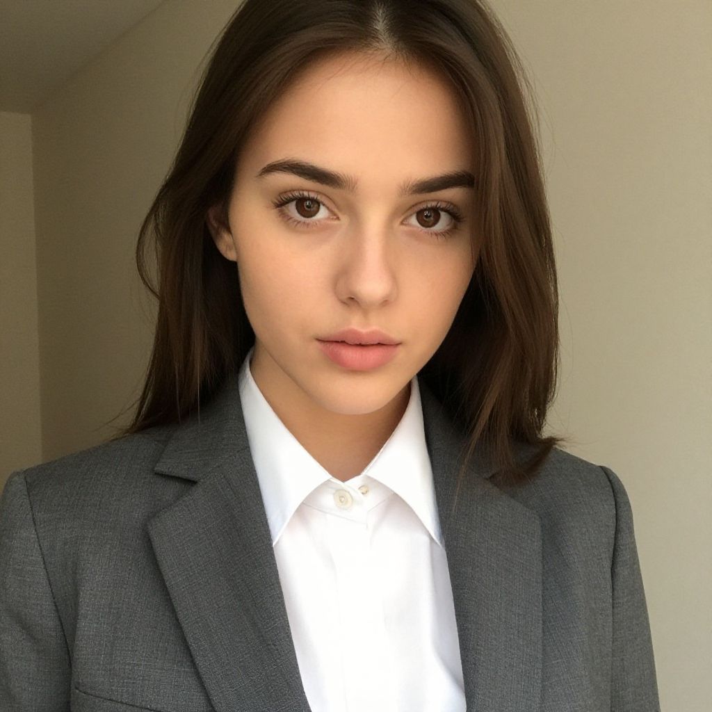 Photograph of a young woman with fair skin and dark brown, straight hair, parted in the middle. She has dark brown eyes, well-groomed eyebrows, and minimal makeup. She is wearing a dark gray blazer over a white dress shirt, giving a professional appearance. The background is a plain, light-colored wall, suggesting an indoor setting with soft, even lighting. Her expression is neutral, and she is centered in the frame, occupying the majority of the image. The texture of the blazer is slightly coarse, contrasting with the smoothness of the white shirt.