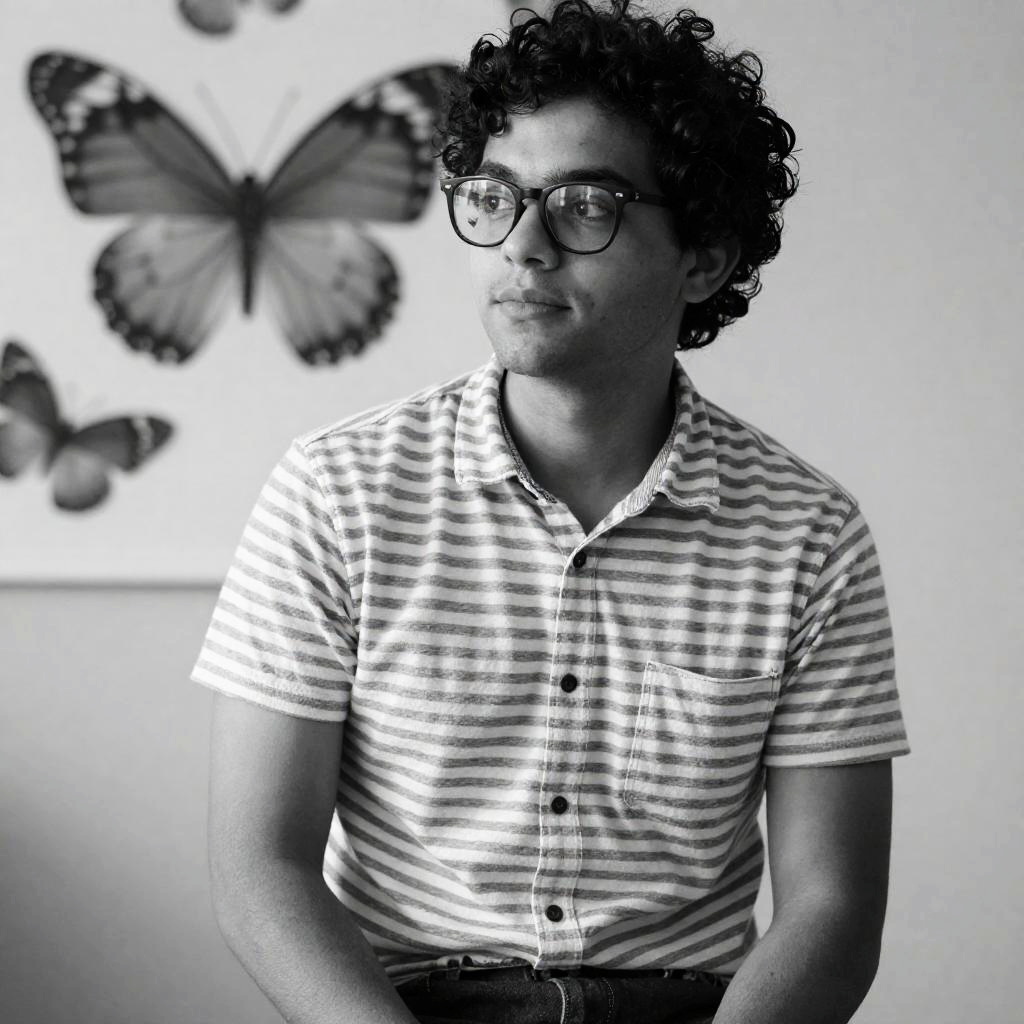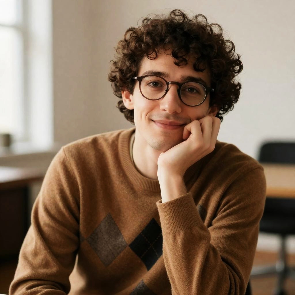 Man with curly dark hair, black-framed glasses, and light blue collared shirt under dark gray sweater, standing against wooden wall. Hands in pockets. Neutral expression. Vertical wooden planks in background. Lighting is soft. Photorealistic style.