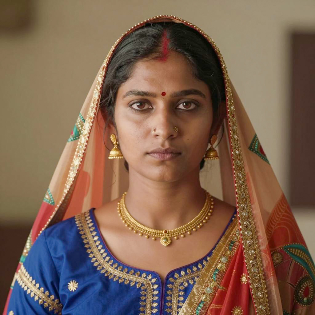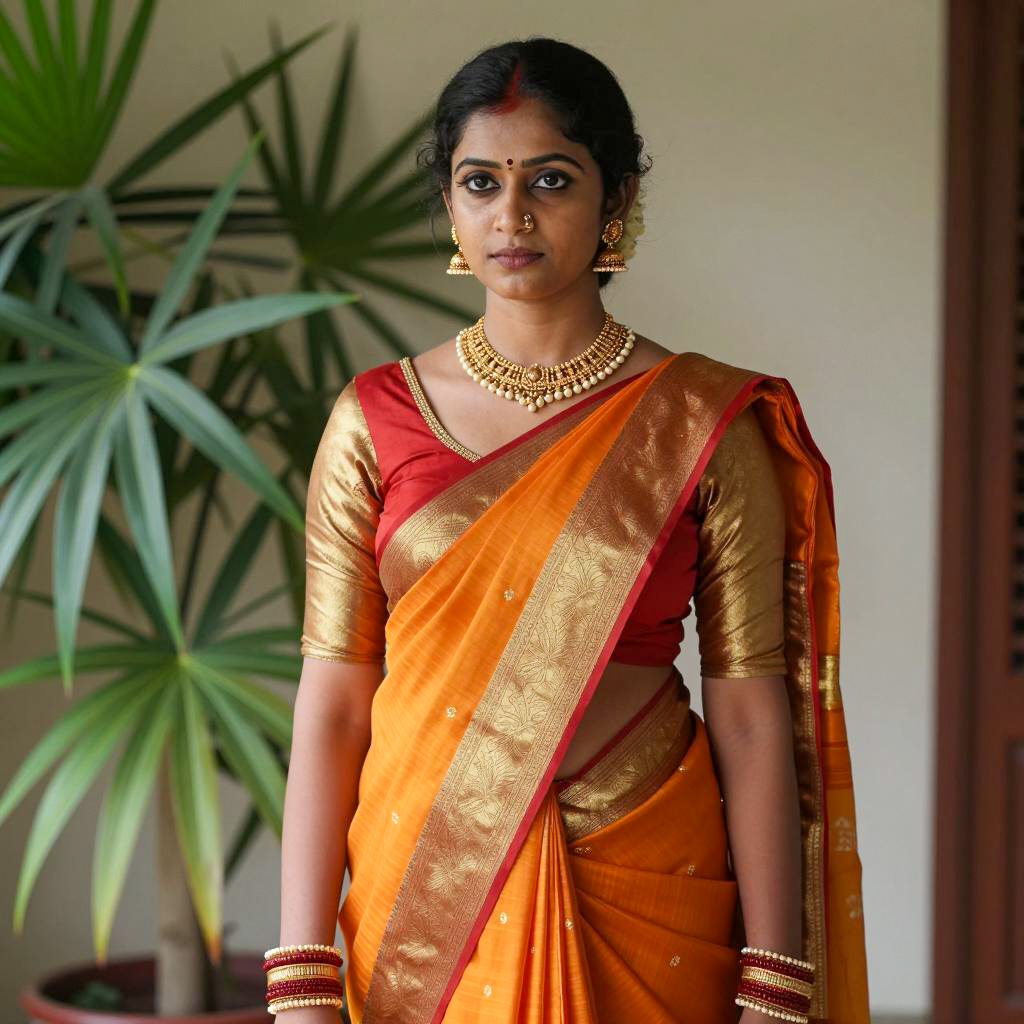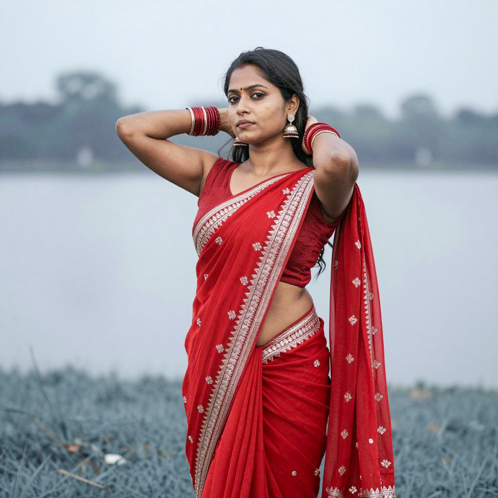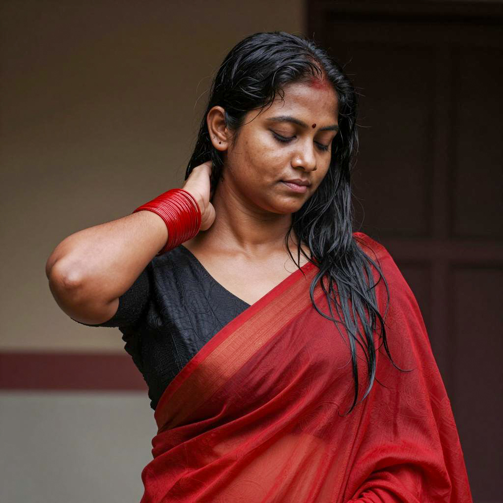 Indian woman with dark hair wearing a red saree and black blouse, hand behind neck, eyes closed, red bangles on wrist. Blurred dark background. Photograph, realistic style. Wet hair, calm expression. Standing, slight forward lean. Single person.
