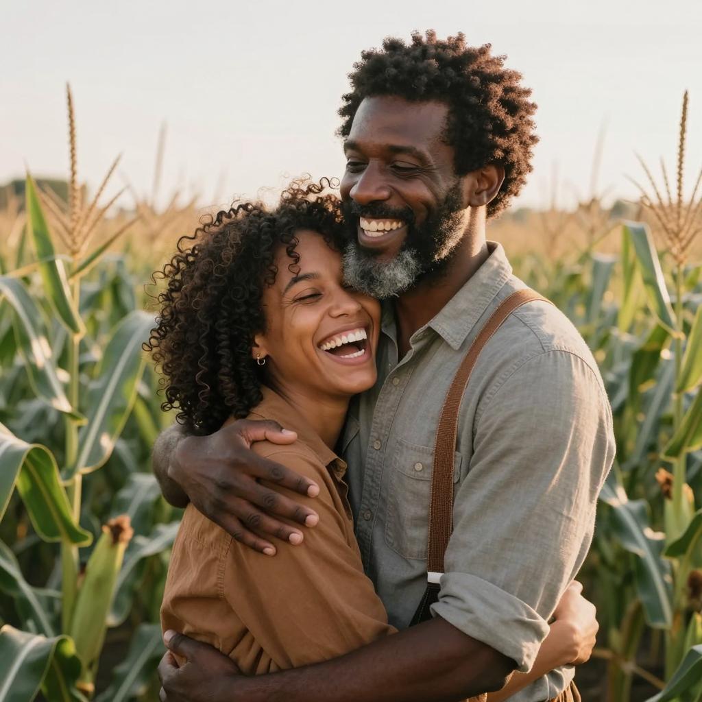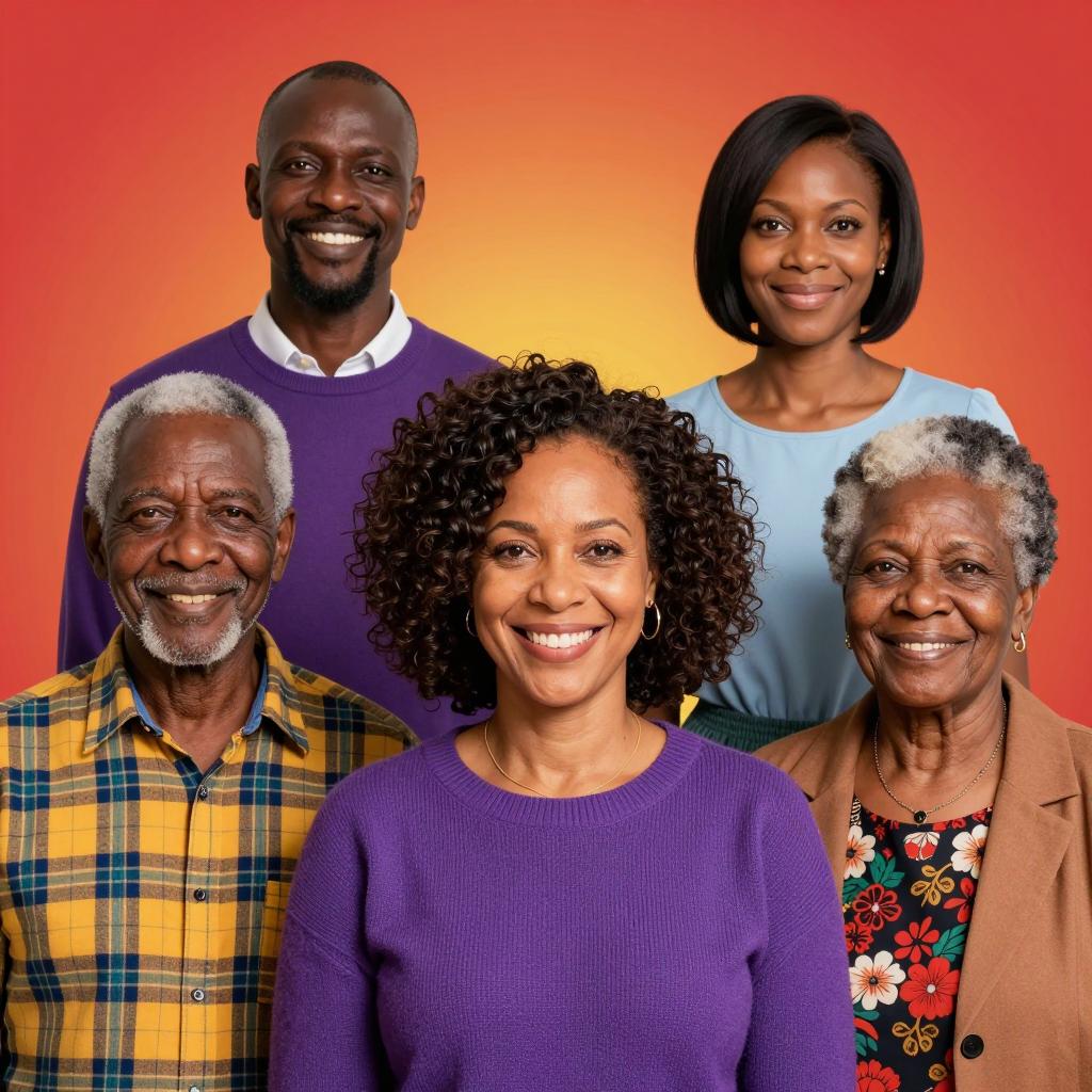 A diverse group of six smiling Black individuals, representing multiple generations, posed against a red to yellow gradient background. The central woman has curly hair and wears a purple sweater. To her left is an older man with gray hair in a yellow plaid shirt. To her right is a woman with black hair in a floral dress and brown jacket. Behind the central woman stand a man with a shaved head in a purple sweater and a woman with short hair in a light blue top. The group is facing forward, exuding warmth and togetherness.