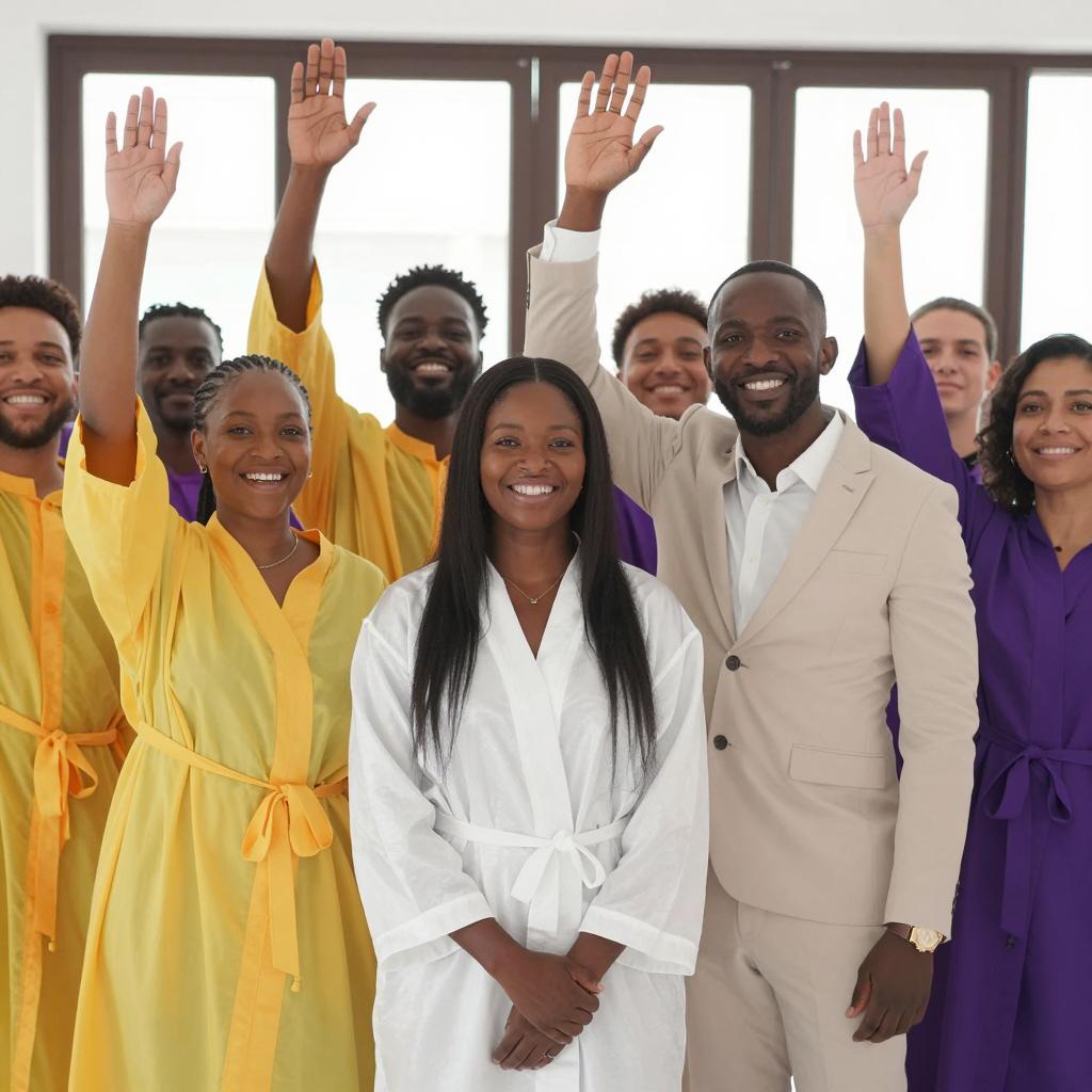 Six people. Central black woman with curly hair, purple sweater, smiling. To her left, older black man with gray hair, yellow plaid shirt, smiling. To her right, black woman with black hair, floral dress, smiling. Behind her, black man with shaved head, purple sweater, smiling. Top right, black woman with short hair, light blue top, smiling. Bottom right, elderly black woman with gray hair, brown jacket, smiling. Red to yellow gradient background. Everyone positioned facing forward, with central woman slightly in front.