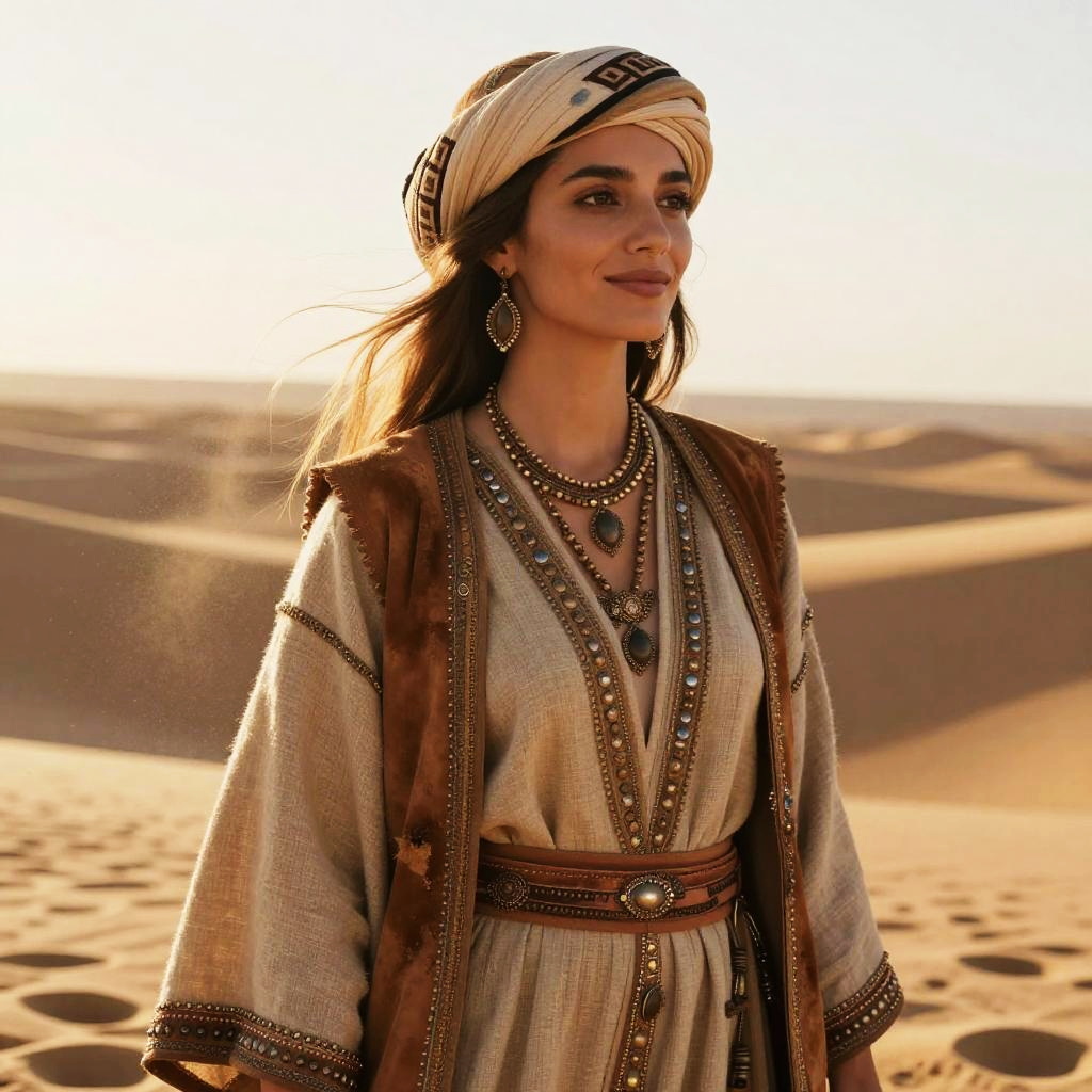 Highly detailed cinematic portrait of an older man with gray hair and beard, dressed in an elaborate, richly embroidered dark robe with gold patterns. The subject wears a large beaded necklace, conveying a wise and contemplative expression. Moody shadows and intricate fabric designs emphasize a mystical and intriguing atmosphere.