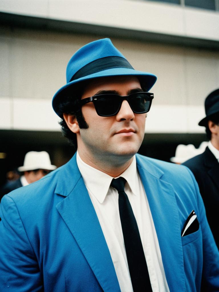 Man in Blues Brothers Fancy Dress costume, cosplay editorial photography, realistic tones