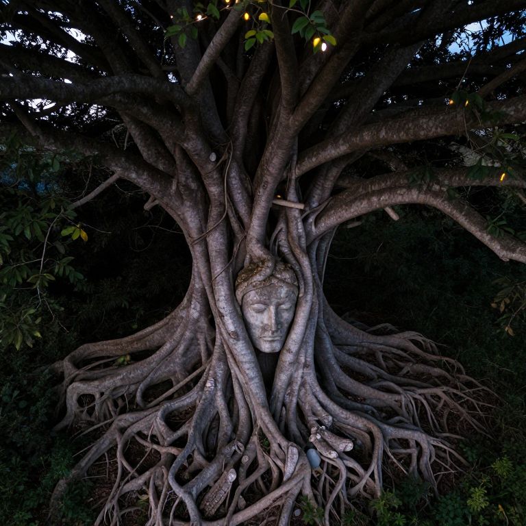 Imagine an aerial view of a wise, ancient tree whose gnarled roots form a contemplative visage, reminiscent of Rodin-esque sculptures in their expression. From this vantage point, the scene's grandeur and depth are emphasized, evoking both serenity and mystery as if the creature is revealing its soul through textured bark, twisted branches, and glowing leaves like embers against the twilight sky. The style captures a surrealistic portrait that highlights the majestic presence of nature, inviting viewers to contemplate the passage of time and the secrets held within this timeless entity.