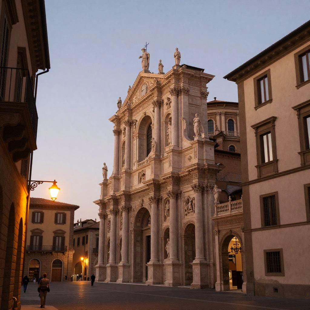 Lecce's baroque architecture showcased in a panoramic view, detailed limestone sculptures on historic buildings, a serene evening sky with warm hues fading, street lamps casting soft glows, a tranquil atmosphere in this Italian cultural gem.