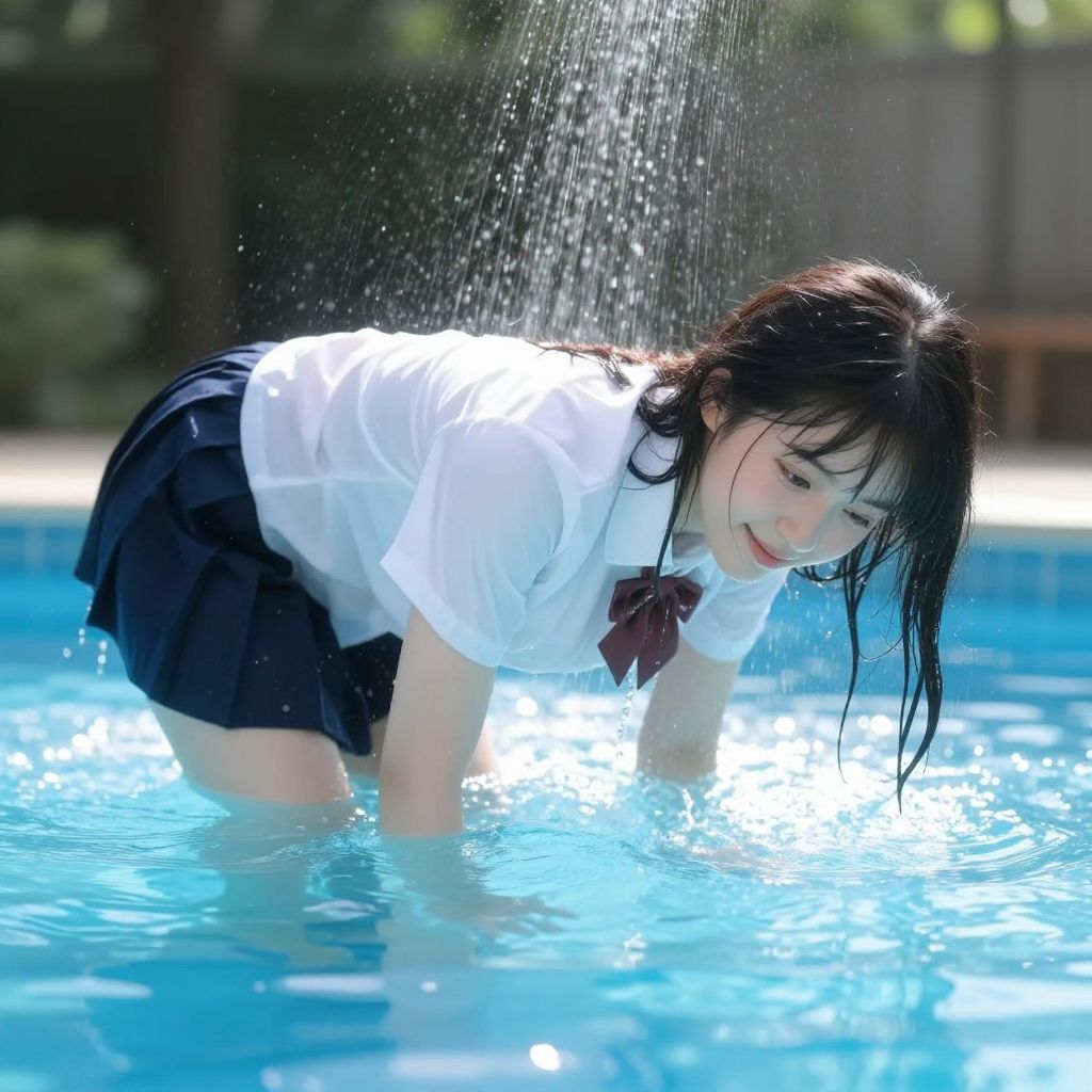(masterpiece:1.2), (best quality:1.1), (highres:1.1), ultra-detailed, in pool, (school:0.9), detailed background, sun shower, outdoors, 1girl, school uniform, bent over, leaning forward, naughty, (bra visible through clothes:1.1), white shirt, floating, HDR, sunlight, (from below:1.1), (in water:1.1)