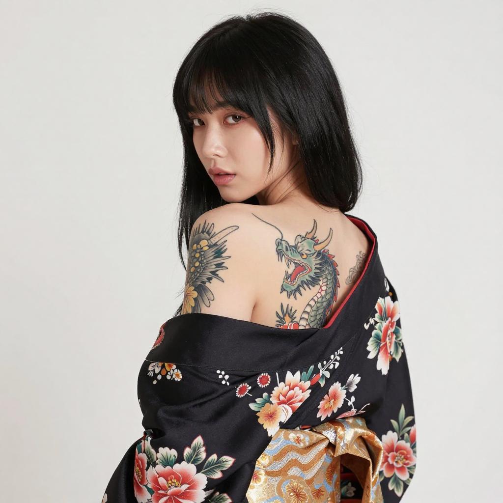 Portrait of an Asian woman with long black hair and bangs, wearing a black floral kimono slipping off her shoulder. She reveals detailed tattoos of a dragon on her back and floral designs on her arm. The background is plain white, highlighting her dark attire and colorful tattoos.