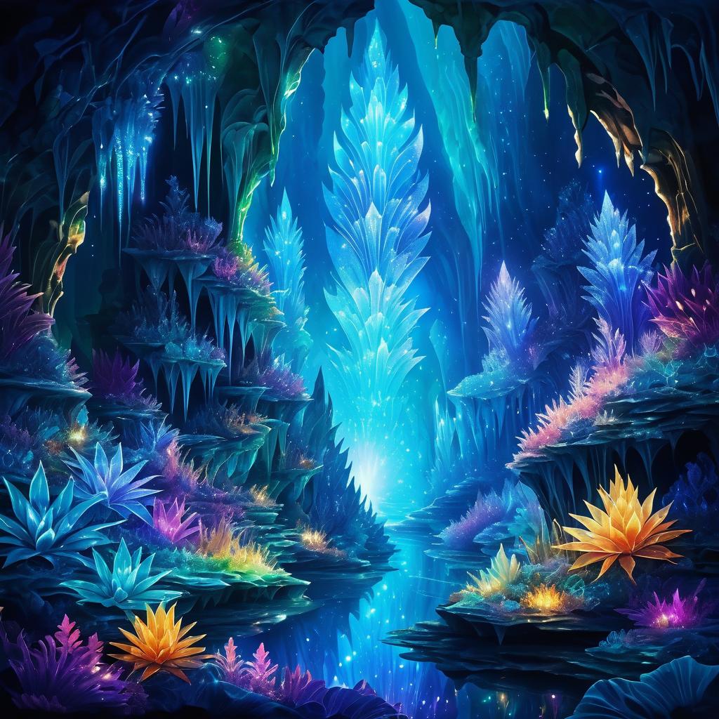 A fantasy painting of a shimmering crystal cave illuminated by bioluminescent plants. The cave features glowing blue crystal structures and vibrant, colorful plants that emit light, creating an ethereal and magical atmosphere with intricate detail and vivid colors.