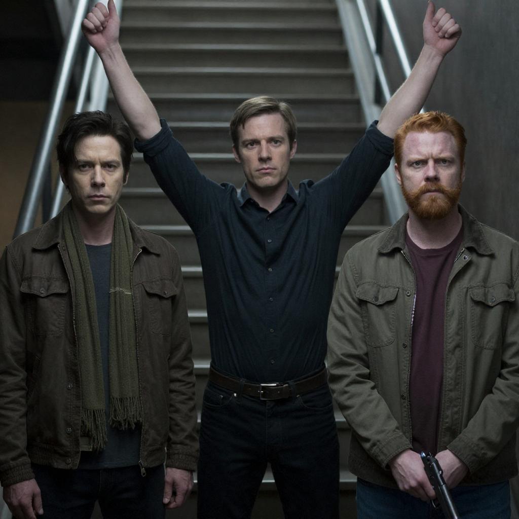Photograph of three men in a dimly lit room with blue lighting. The man in the center, with short brown hair and a rugged face, wears a dark shirt and stands slightly forward. The man on the left, bald with a serious expression, holds a rifle. The man on the right, with a beard, stands behind them, also in a dark shirt. Blue curtains hang in the background.