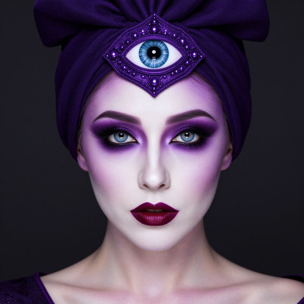 A woman with pale face paint and striking blue eyes is shown wearing a dramatic purple headpiece adorned with a central ornamental eye design. Her makeup is bold, with vibrant purple eyeshadow and matching markings on her cheeks, complemented by deep red lipstick, creating a fantasy-inspired, theatrical look.