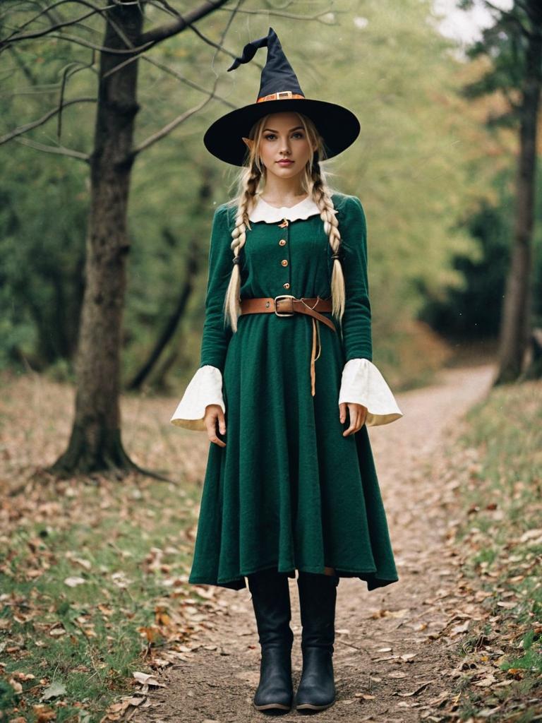 Elf witch costume, elf, pointy ears, blonde hair, braid, hat, twin braids, 1girl, witch hat, outdoors, long hair, boots, belt, solo focus, standing, blurry, dress, day, full body