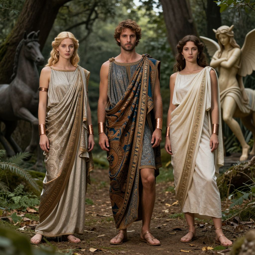 Elegant greek mythology clothes featuring draped togas and chitons with ornate patterns, rich fabrics blending silk and linen, complemented by bronze arm cuffs and sandals, surrounded by mythical creatures like centaurs and nymphs in a lush forest setting.