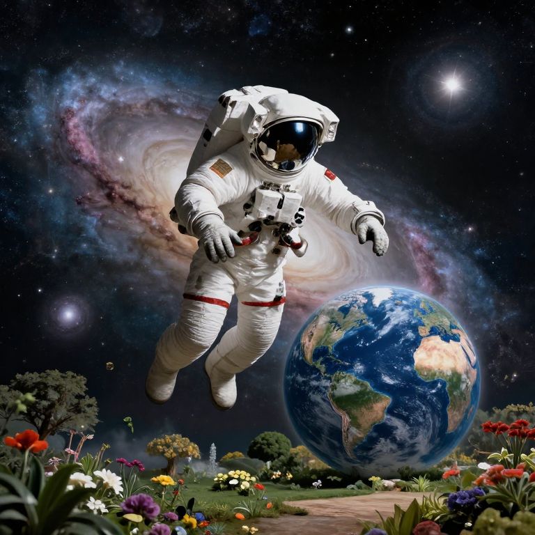 Imagine a visually stunning digital artwork that merges surreal landscapes with cosmic vistas, reminiscent of Magritte's enigmatic scenes reimagined through a celestial photographer's perspective. An astronaut drifts gracefully amidst the swirling patterns of galaxies and nebulae, yet his mundane spacesuit is mirrored by an unexpected reflection—a serene garden on Earth that contrasts sharply with the grandeur of space. This composition seamlessly intertwines the ethereal beauty of cosmic wonders with the comforting familiarity of terrestrial nature, evoking a profound emotional journey for viewers as they contemplate their role in the vast universe and challenge their perception of reality.