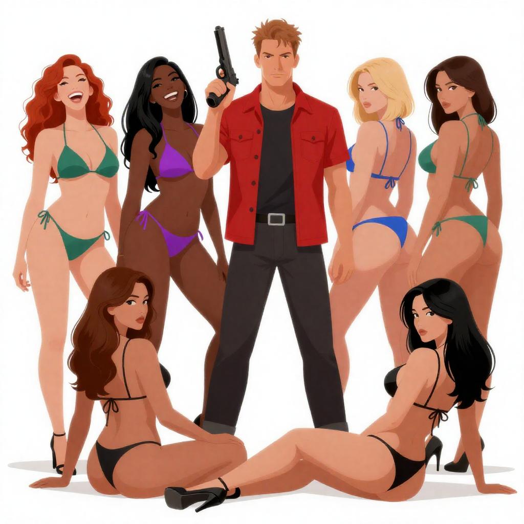 Illustration of six people. Man in red shirt holding gun, standing center. Five women in bikinis and lingerie, seated and reclining. Red-haired woman facing away, green bikini. Black-haired woman laughing, purple bikini. Blonde woman with short hair, blue bra, looking back. Dark-haired woman in black lingerie, lying down. White background. Women's expressions: laughing, looking back. Gunman's expression: serious.