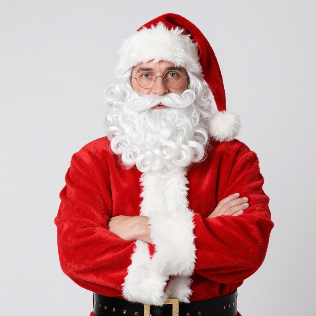 Photograph of a Santa Claus-like man with a white beard, round glasses, red velvet suit with white fur trim, and black belt, arms crossed