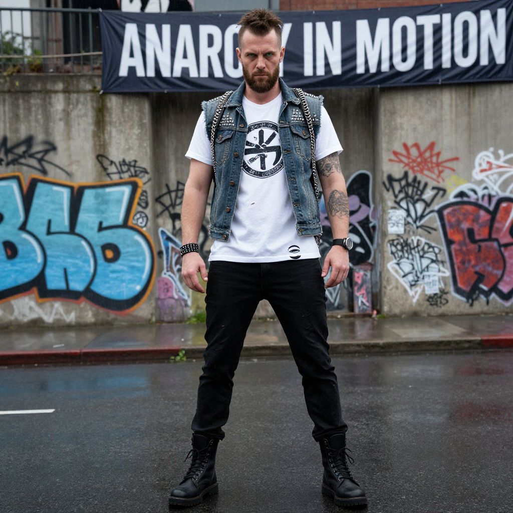 Photograph of a bearded, Caucasian man with short brown hair standing confidently on a wet, urban street. He wears a white t-shirt with a black graphic, a studded denim vest, black pants, and black boots. His arms are tattooed, and he sports a black wristband. The background features a graffiti-covered concrete wall with a large black banner above reading "ANARCHY IN MOTION." The graffiti includes colorful tags and designs, with notable blue and red graffiti on the left. The street is wet, indicating recent rain. The man's stance is wide and assertive, embodying a rebellious, punk aesthetic.