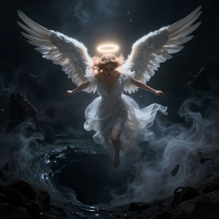 An emotional fall-from-grace scene with an angelic being losing wings while descending into a shadowy abyss, glowing halo dimming, contrasting light and darkness, dynamic composition featuring swirling smoke and fragmented heavenly imagery, fantasy art style