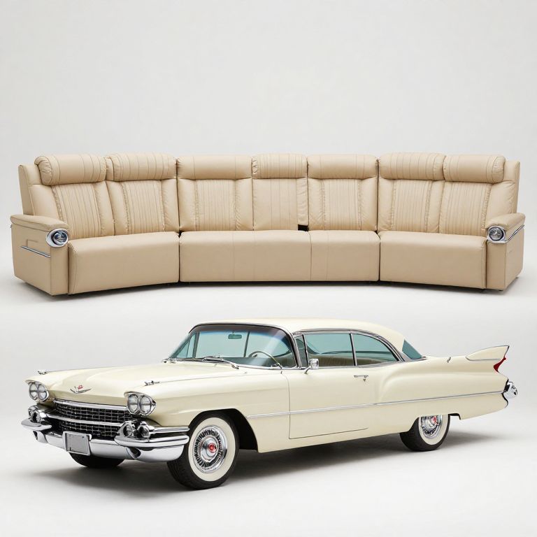 Photograph of a classic beige leather sectional sofa above a vintage cream-colored 1950s car with chrome accents, both set against a white background.