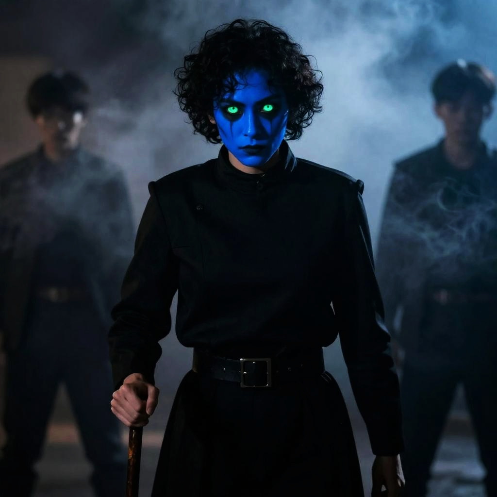 Person with glowing blue face paint, neon green eyes, and black costume, holding a wooden cane, in smoky, dimly lit background. Two other people in dark clothing in background, one partially visible on left, one on right. Smoke fills scene. Person in foreground has curly hair, intense expression.