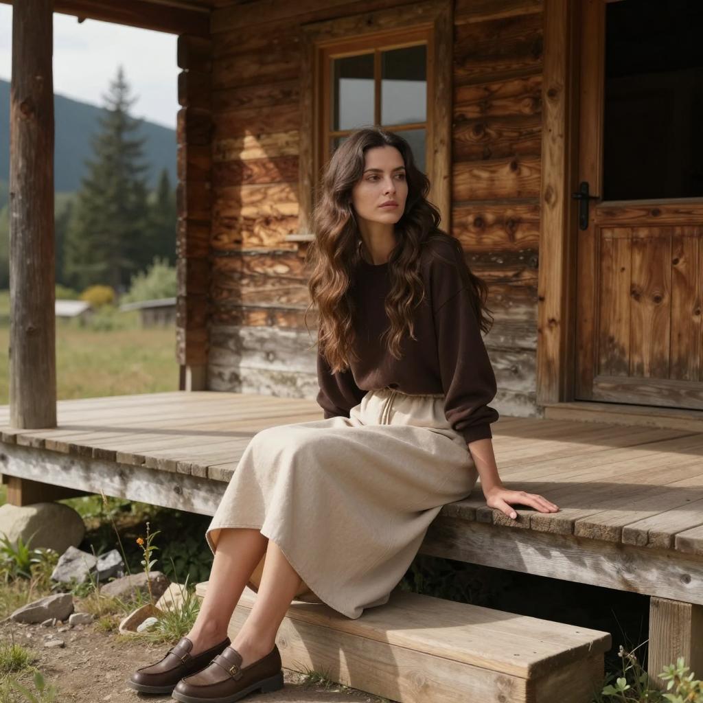 Photograph of a woman with long brown hair, wearing a dark brown top and beige skirt, sitting on a wooden step in front of a rustic wooden cabin. She looks to the side with a neutral expression. Background includes trees, mountains, and a rocky ground. The cabin has a wooden porch and is slightly elevated on stilts. Sunlight casts shadows on the ground and cabin.