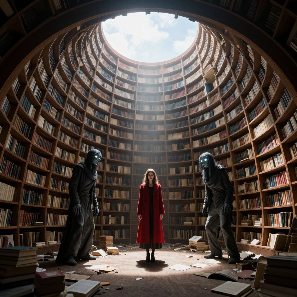 Surreal library shelves spiral upward within a hollowed-out planet, illuminated by natural light streaming through a circular opening above, while two eerie, glowing-eyed figures flank a solitary woman in a red coat, surrounded by scattered books and debris on the floor.