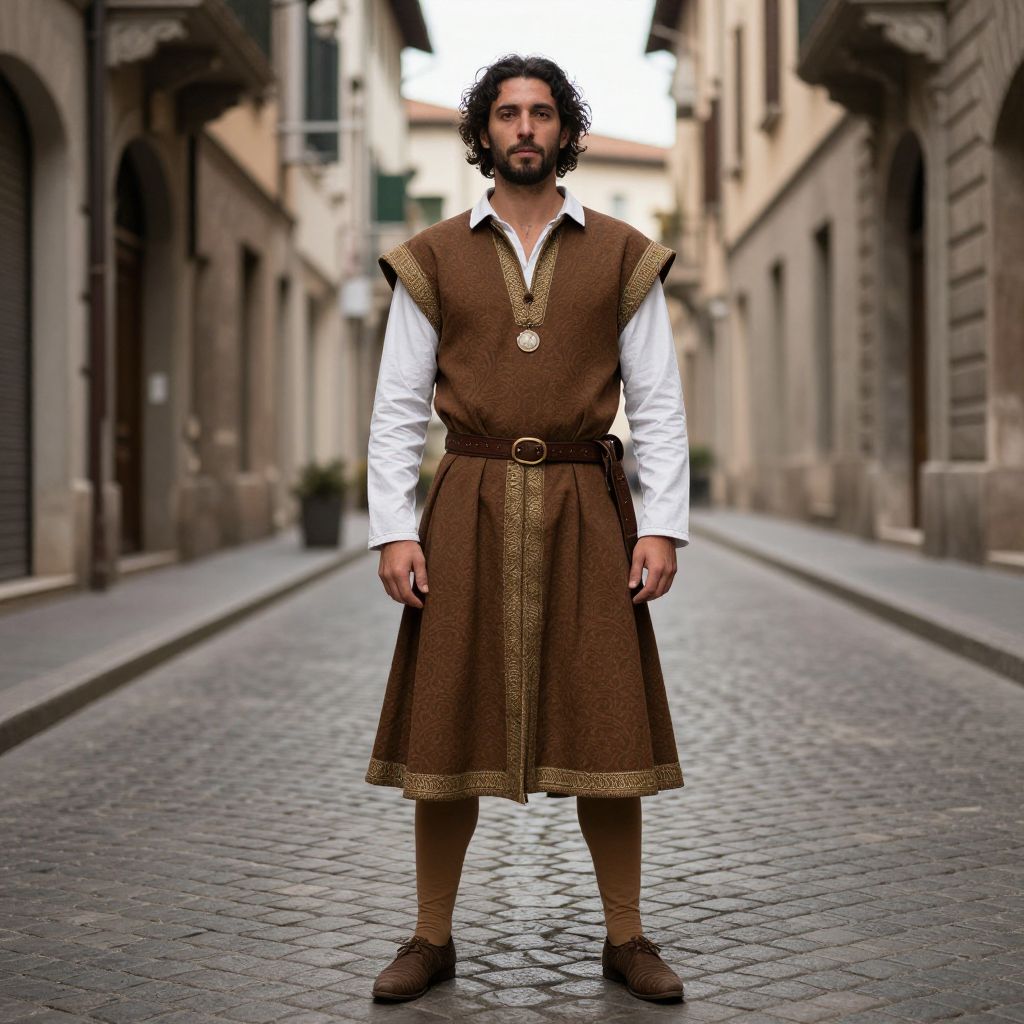 Photograph of a middle-aged man with curly black hair and a beard standing in a narrow, cobblestone alleyway between tall, old stone buildings. He wears a brown, medieval-style tunic with gold trim over a white long-sleeve shirt, brown belt, and brown shoes. His tunic is knee-length and cinched at the waist. The alleyway is slightly blurred, focusing attention on the man. The background features arched windows and doorways, adding to the historic ambiance. The sky above is overcast, casting a soft, diffused light on the scene. The overall color palette includes earthy browns and grays.