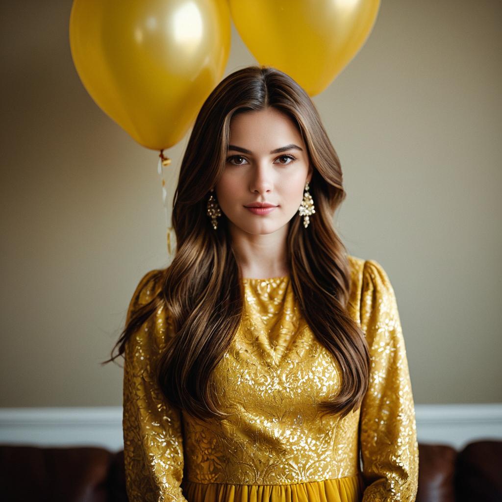 Portrait of a young woman with long brown hair wearing a golden-yellow dress with intricate patterns and long sleeves. She has dangling earrings and stands in front of a neutral blurred background, with two yellow balloons visible behind her. The photo exudes a celebratory and elegant atmosphere.
