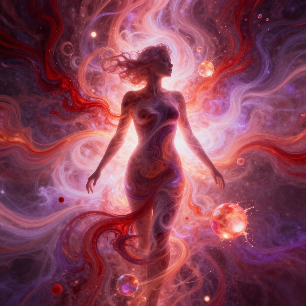Digital art of a silhouetted, ethereal female figure with flowing hair, standing at the center of a vibrant, cosmic background. She is surrounded by swirling, wavy tendrils of red, pink, and purple light, with glowing orbs and stars scattered throughout. The figure's form is outlined in dark, shadowy hues, contrasting with the bright, luminous colors behind her. Her arms are slightly outstretched, and her face is turned upwards, suggesting a sense of empowerment or transcendence. The overall style is reminiscent of fantasy or sci-fi digital art, with a dynamic, otherworldly composition.