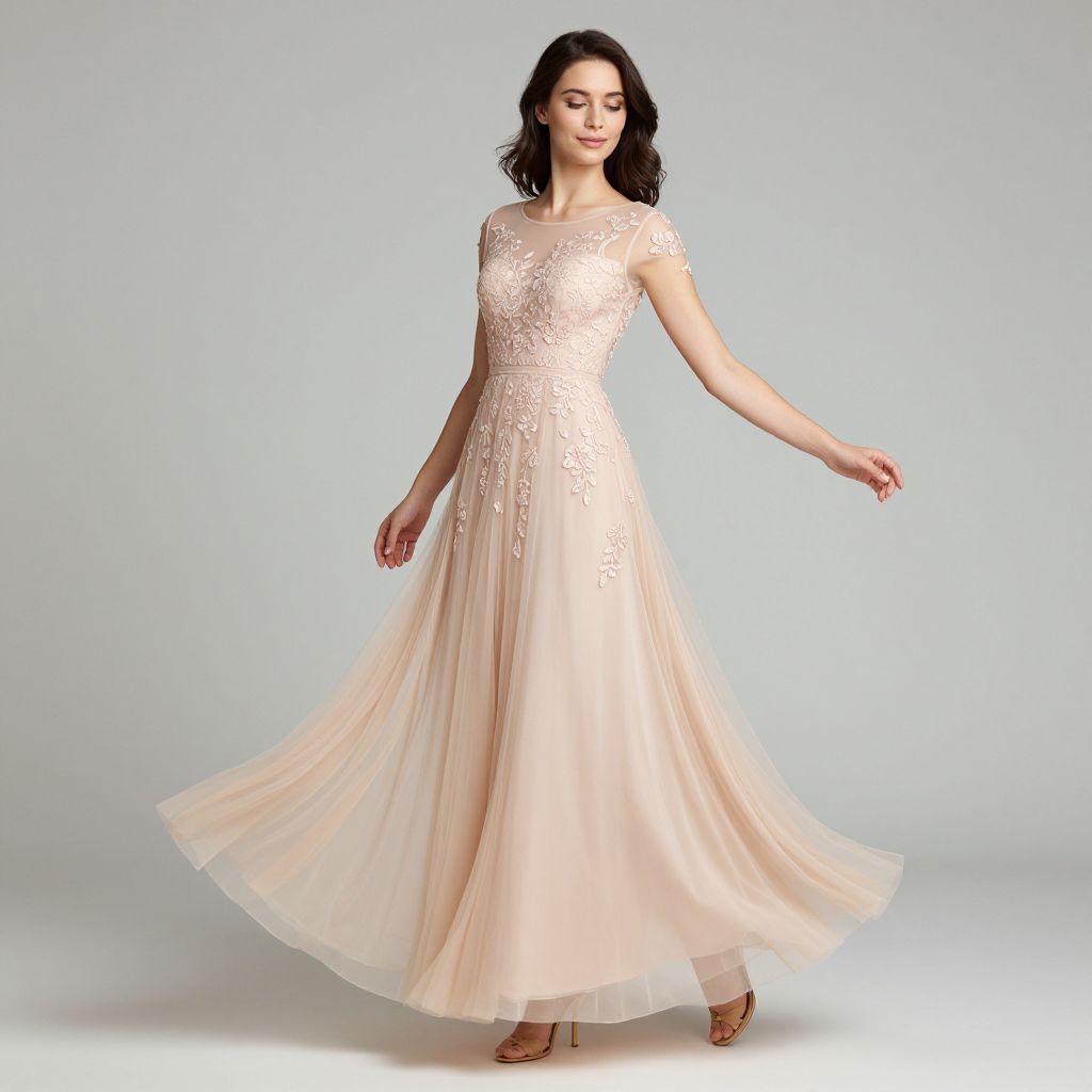 Elegant woman twirling gracefully in a blush-colored, fairy-inspired mesh tulle embroidered chiffon dress featuring delicate floral embellishments and a flowing skirt.