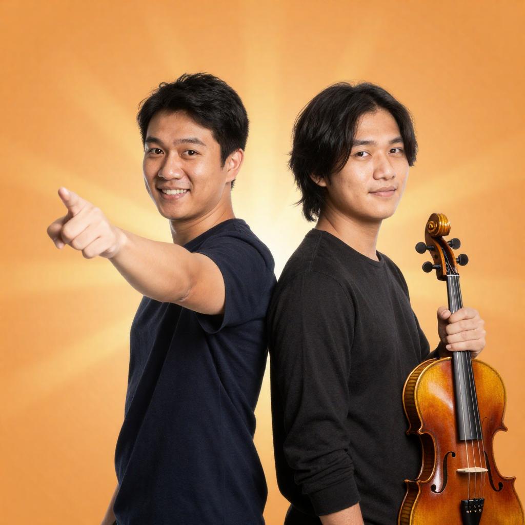 Photograph of an Asian man with short black hair playing a violin, wearing a white shirt with red cuffs, leaning forward. Another Asian man with glasses and dark hair stands in the background. Red curtain with orange light pattern in the background. Violin bow in his right hand, left hand on strings.