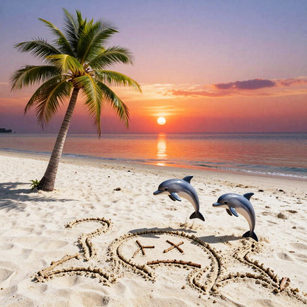 Photograph of a tropical beach at sunset. A tall palm tree with green fronds stands on the left, casting a shadow on the white sandy shore. Two dolphins leap mid-air in the foreground, their sleek, gray bodies contrasting with the bright sand. The sun, a vibrant orange, is low on the horizon, casting a golden reflection on the calm ocean. The sky transitions from deep purple to pink, with scattered clouds. The sand has dolphin-shaped footprints. The overall scene is vibrant and serene, capturing the beauty of a tropical sunset.