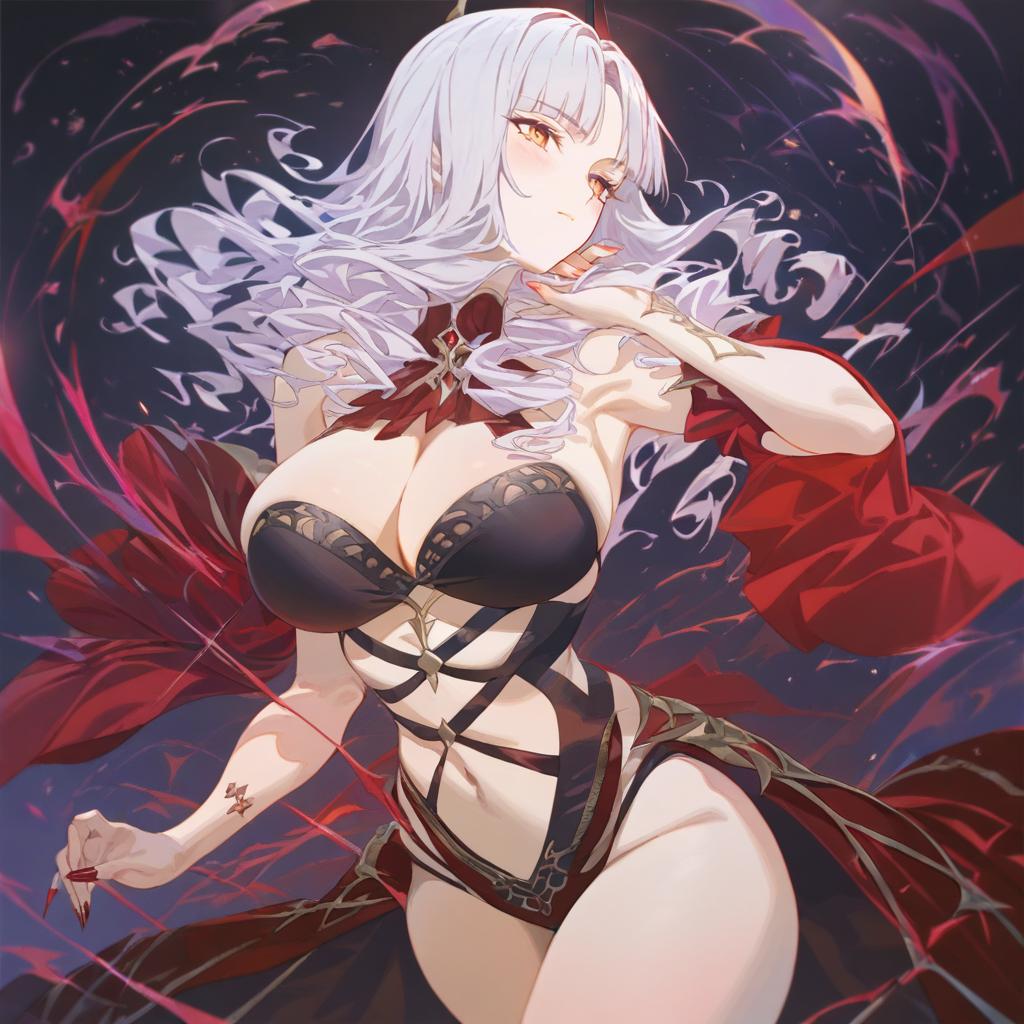 Caren hortensia (amor caren), fate (series), 1girl, yellow eyes, white hair, wavy hair, long hair, very long hair, medium breasts, thighs, red headwear, red dress, black pantyhose, long sleeves, neck ribbon, beret, brooch, shawl, by artist hanada yanochi, animagine