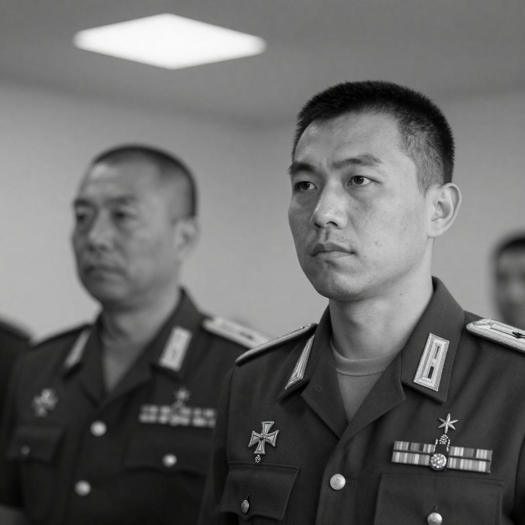 Black and white photograph featuring two Asian male military officers in dark uniforms adorned with cross-shaped insignias and multiple medals. The foreground officer has a serious expression, short hair, and detailed badges on his chest and shoulders. The background officer appears older with a neutral expression, the image set in an indoor environment with a blurred wall and ceiling light.