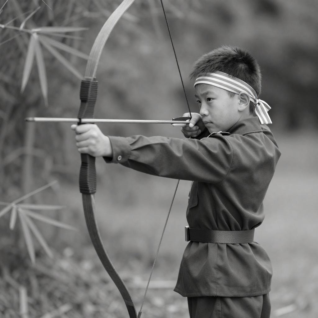 Black-and-white photograph of a man with long hair, wearing a striped shirt and black pants, standing beside a motorcycle. He is holding a rifle to his shoulder, aiming upward. The motorcycle is positioned to the left, with trees in the background. The man's posture is upright, and his expression is focused.