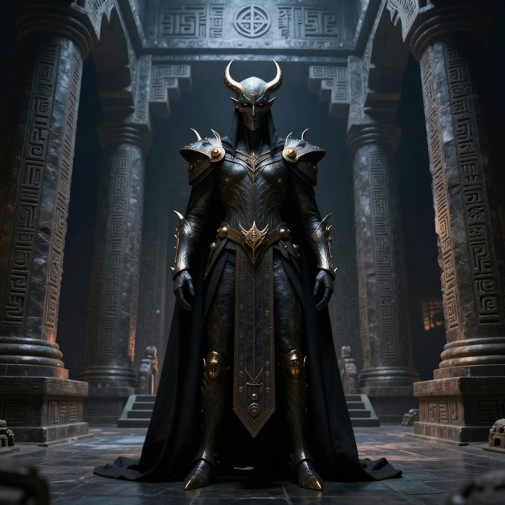 CGI fantasy image of a stern, dark-skinned woman in black, ornate armor with horns, standing in a dimly lit, ancient temple