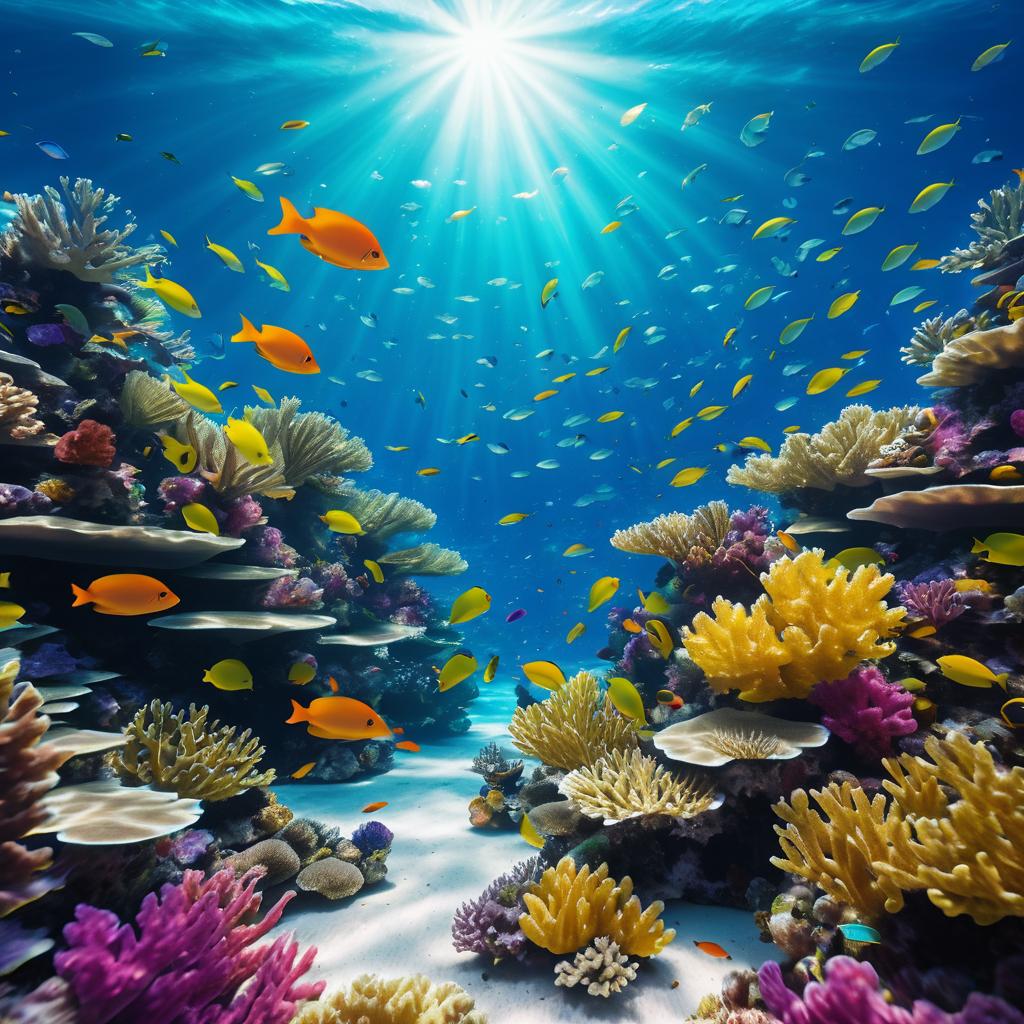 A photorealistic underwater scene of a vibrant coral reef teeming with various colorful tropical fish. Sunlight beams penetrate the clear blue water, illuminating the diverse coral formations including yellow, pink, purple, and orange corals. The image showcases a rich marine ecosystem with a sandy ocean floor and a wide variety of small and medium-sized fish swimming throughout the reef.