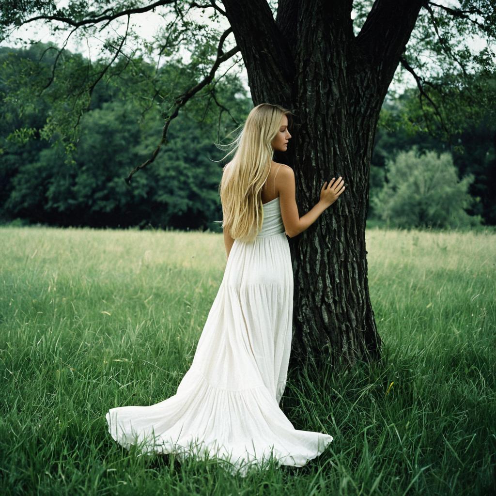 Bohemian fashion costume ,1girl, solo, dress, jewelry, long hair, necklace, nature, tree, outdoors, forest, brown hair, red dress, blonde hair, realistic