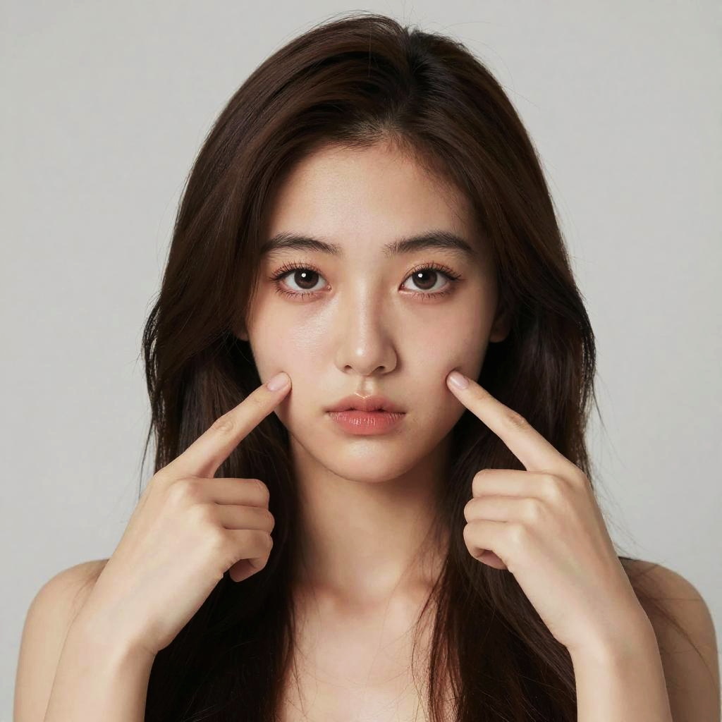 Close-up portrait of an East Asian young woman with long dark hair, pointing at her cheeks with both index fingers. The photo features a neutral gray background and soft, even lighting highlighting her clear skin and natural makeup.