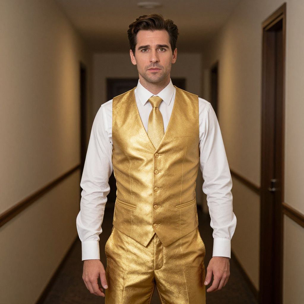 Morph Costume, man in a gold vest and tie standing in a hallway
