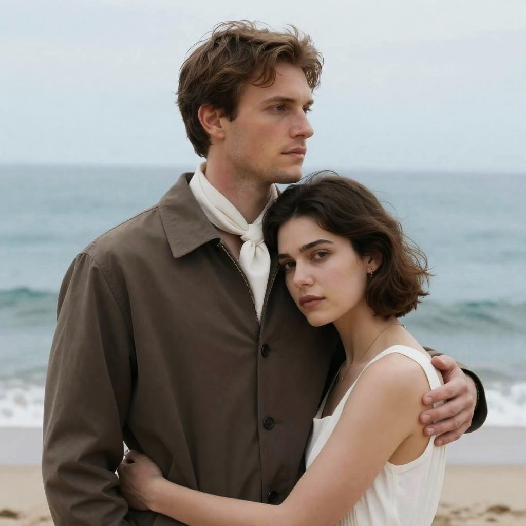 Photograph of a serious-looking young white man with short blonde hair and a white shirt, standing beside a serious-looking young white woman with dark hair in a ponytail, wearing a white dress. Both have intense expressions. Light filters through abstract white structures in the background. Man's left hand rests on a metallic object. Light flares are visible.