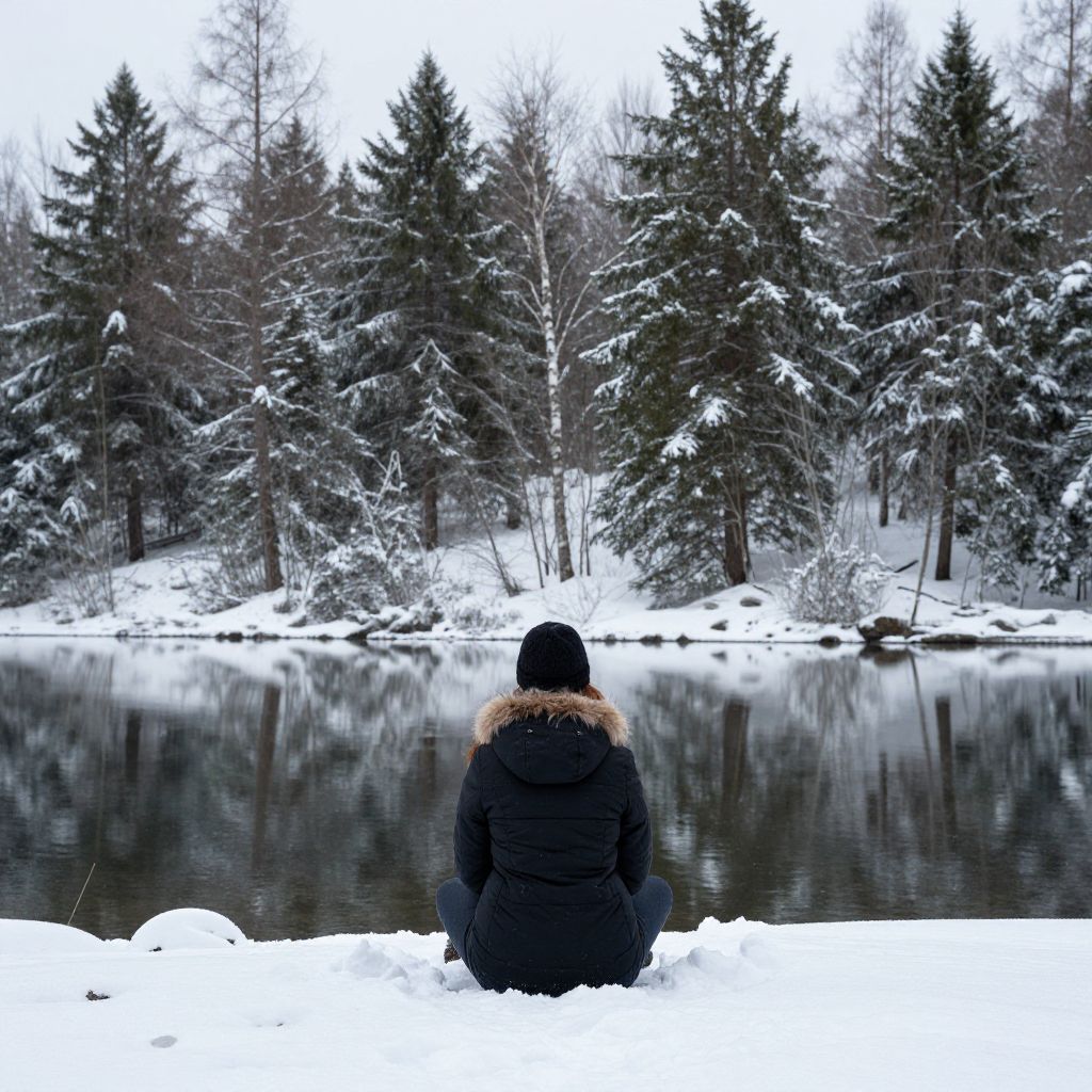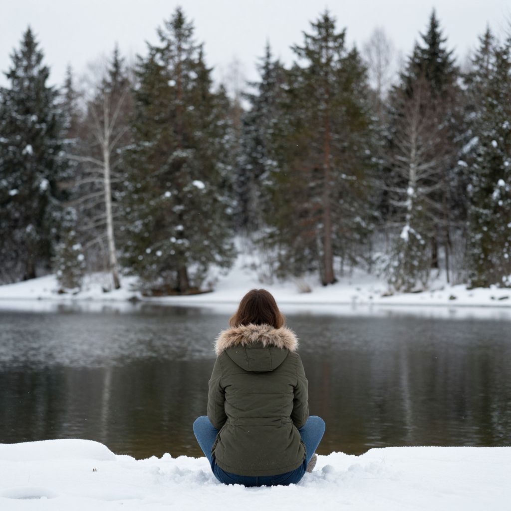 Woman Sitting by Winter Forest Lake