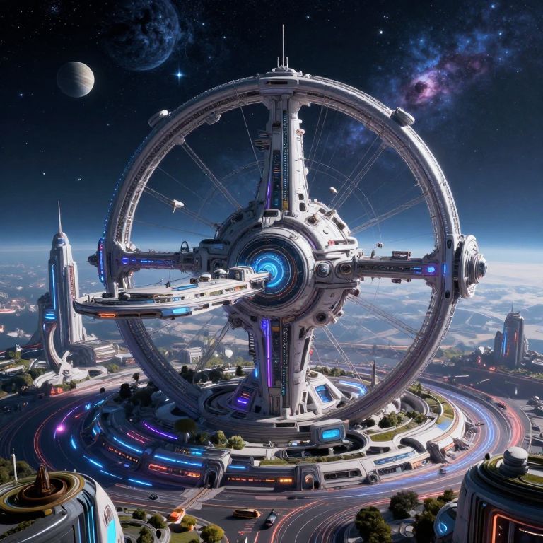 Digital artwork of a futuristic, space-age cityscape featuring a massive circular tower with neon lights, surrounded by bustling roads and skyscrapers, set against