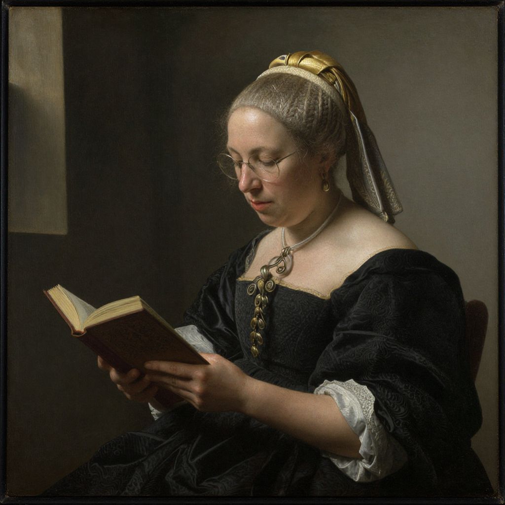 Photograph of a 17th-century-style woman with glasses, wearing a black dress with lace, reading a book, against a dark background.
