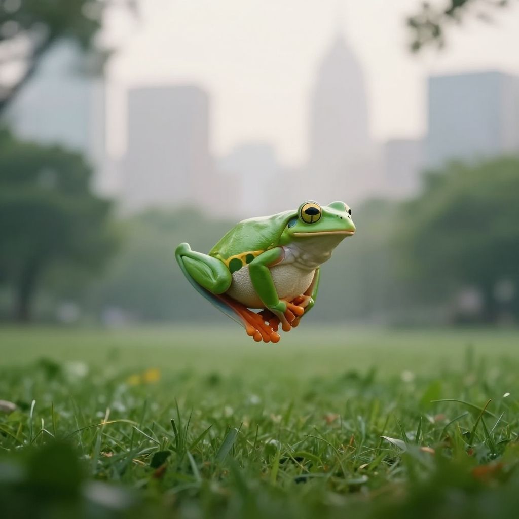 Flying frog pose in an urban park, surrounding greenery with city skyline, early morning mist, calm meditative vibe, high detail on frog-like balance and body posture