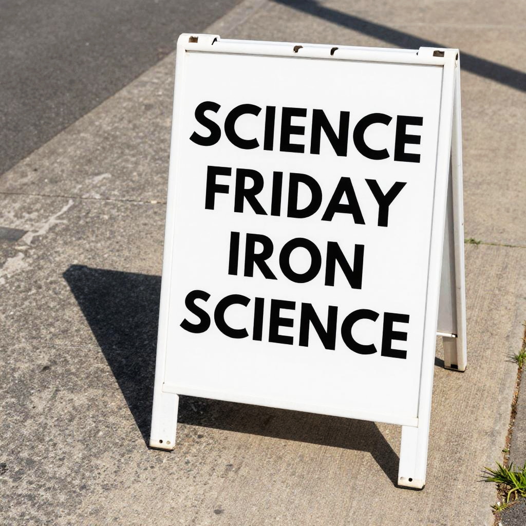Photograph of a white sign with bold black text "SCIENCE FRIDAY FROM SCIENCE" on a concrete sidewalk, casting a shadow in bright