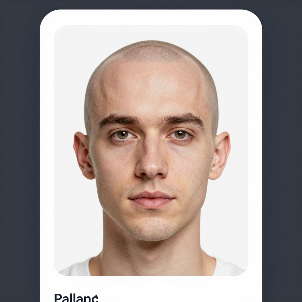 Make me bald online free, digital transformation of a portrait photo into a bald head style, realistic skin texture, smooth scalp, high resolution, natural lighting, clean background, modern graphic interface elements, user-friendly online tool concept.